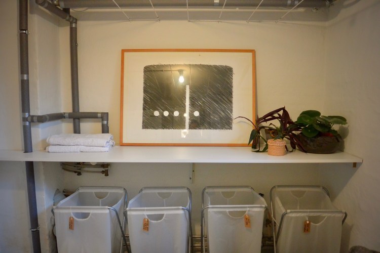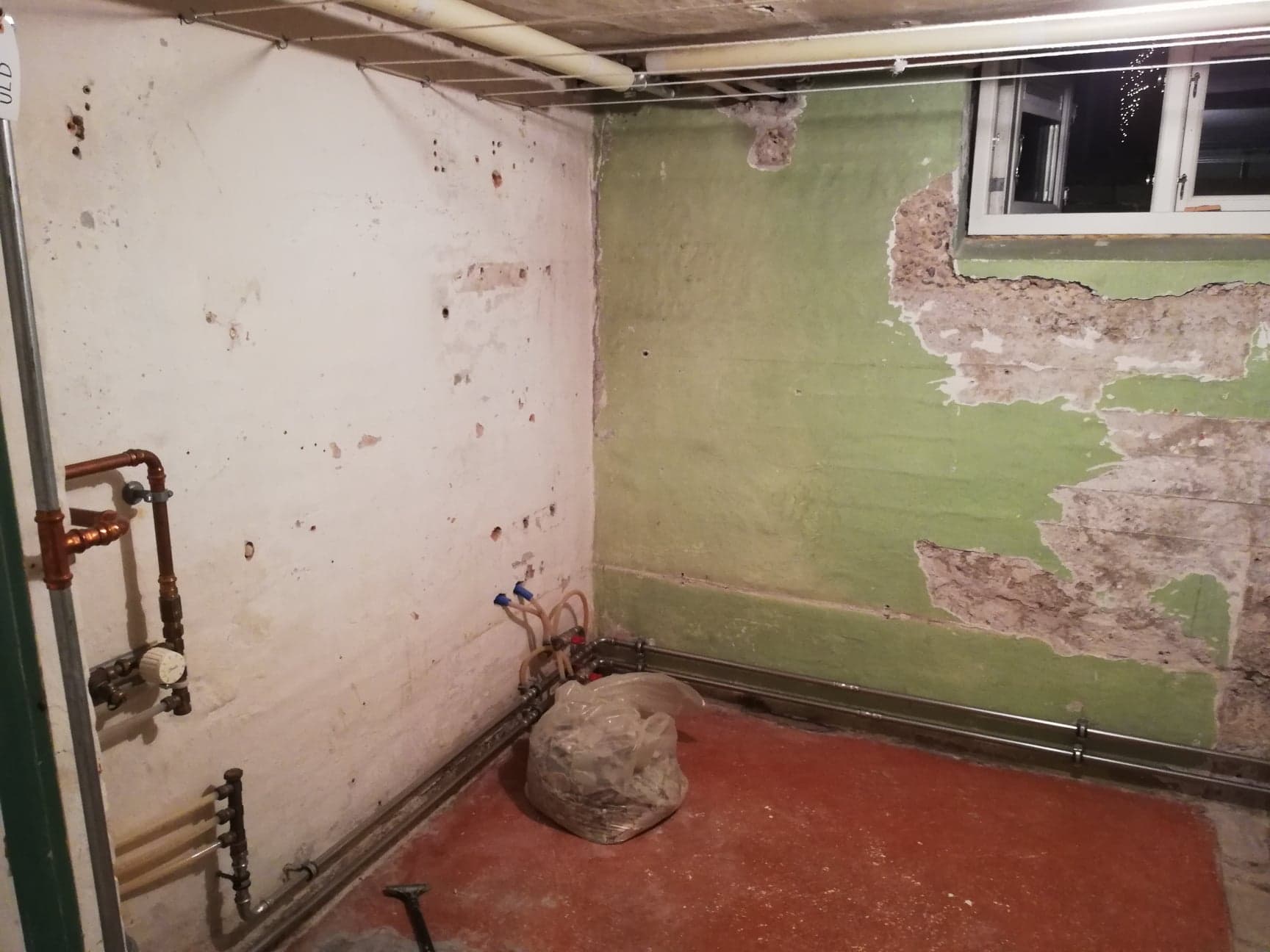 En forsømt vaskekælder med tre forskellige farver maling, og huller i væggene blev forvandlet til et lyst og tiltalende vaskerumrum.